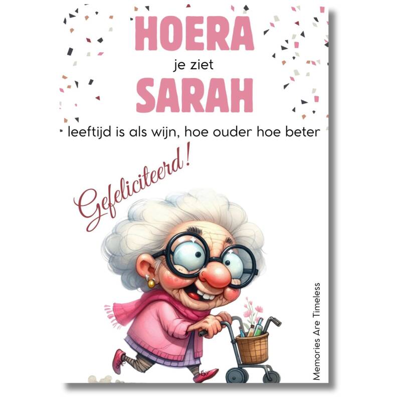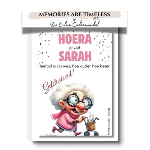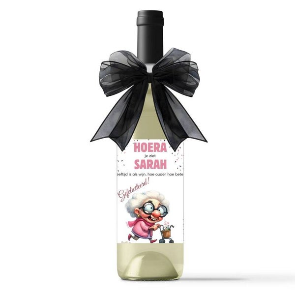 Wijnetiket | Hoera Sarah | Oud vrouwtje